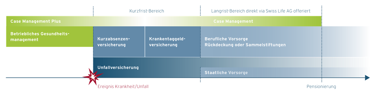 Case Management ist ein Teil des betrieblichen Gesundheitsmanagements. Dieses unterstützt Unternehmen bei der Prävention sowie bei wiederholten Abwesenheiten und bei der Reintegration von Mitarbeitenden. Dank Case Management lassen sich die Prämien der Krankentaggeldversicherung stabilisieren oder gar senken. Für weitere Informationen klicken Sie bitte hier.