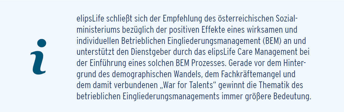 Die Mitarbeitenden sind die wichtigste Ressource eines Unternehmens. Nur wenn die Belegschaft gesund und einsatzfähig ist, kann sie einen Mehrwert für den Betrieb schaffen. Die Corona-Krise hat nochmals vor Augen geführt, wie wichtig Gesundheit ist und welche Auswirkungen krankheitsbedingte Fehlzeiten und Gesundheitsrisiken auf die Produktivität haben. elipsLife bietet deshalb in Ergänzung zur Versicherungsdeckung bereits seit Jahren zusätzliche Serviceleistungen zur Gesunderhaltung der Belegschaft an, weil Prävention und Wiedereingliederung für alle Parteien immer besser sind als nur eine Versicherungsleistung alleine. Je nach Deckungskonzept erhalten Arbeitgeber daher zusätzlich verschiedene Bausteine aus dem elipsLife Care Management, wobei die Inanspruchnahme dieser Leistungen für den Arbeitgeber und seine Mitarbeitenden freiwillig ist.