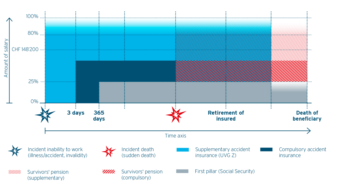 The compulsory accident insurance offered by elipsLife provides all the cover prescribed by the law: in the event of an accident, the insurance covers loss of earnings, medical treatment as well as pension and survivors’ benefits in compliance with the Federal Law on Accident Insurance.