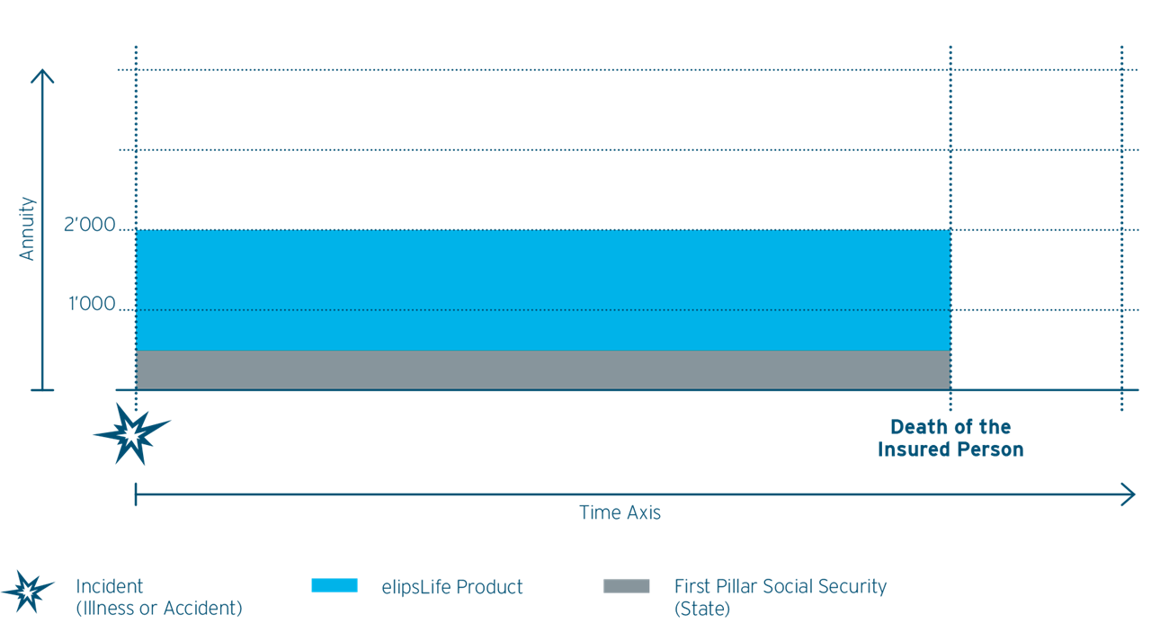 In the event of an affiliate’s disability, the level of disability is assessed by a doctor based on the recognized score system Activities of Daily Living (ADL) This score system determines the insured person’s level of disability based on six daily self-care activities, whereof each is rated with a maximum of 10 points. The benefits are payable in full once an insured reaches at least 45 points in total. The insured person has to be at least 90 days in state of dependency in order to qualify for the benefit payment. As the contract does not include a waiting period, the annuity is paid to the insured retroactively, as from the start date of dependency.