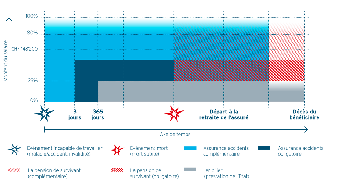 L’assurance-accidents prescrite par la loi n’étant dans de nombreux cas pas suffisante, elipsLife propose une couverture d’assurance élargie. L’assurance-accidents complémentaire complète les prestations de l’assurance-accidents obligatoire en fonction des besoins. Elle convient aussi bien aux collaborateurs dont les salaires sont supérieurs au salaire LAA maximal qu’à l’ensemble des employés en complément de l’assurance LAA obligatoire. Cela comprend les indemnités journalières pour le premier et le deuxième jour d’absence suivant l’accident, le complément de la perte de salaire au-delà du salaire LAA maximal (148nbsp200 CHF), le traitement en division privée partout dans le monde, l’assurance d’un capital ou d’une rente complémentaire en cas de décès ou d’invalidité et la couverture des risques spéciaux réduits ou exclus par la LAA.